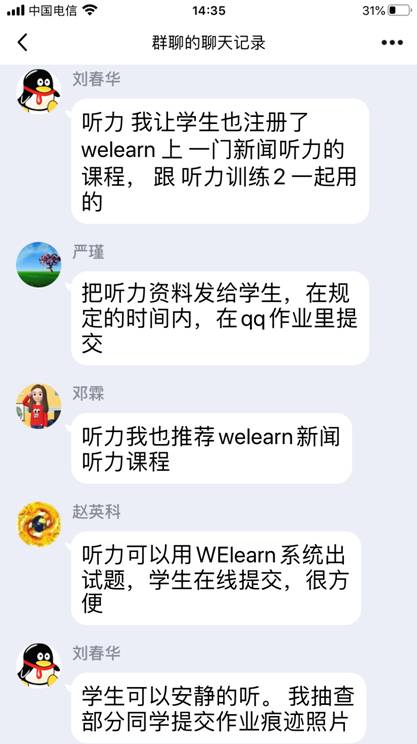 随后,老师们就口语和听力教学进行了交流。教研室副主任邓霖老师首先分享了A班口语教学方案,韩松老师介绍了分组练习和全班互动模式,严瑾老师建议使用“QQ电话”进行口语对话。在听力教学方面,老师们一方面布置学生自主学习We Learn随行课堂上的新闻听力内容,一方面使用国家级规划教材《新世纪听力训练2》的扫描件和音频文件给学生上课,学生把自己做的听力练习答案上传到iWrite系统里或拍照发到QQ作业中。虽然老师们给学生布置的听力练习较多,学生们都不折不扣地完成了,老师们针对学生做错的地方重点讲解,学生反馈说听力提高了不少。