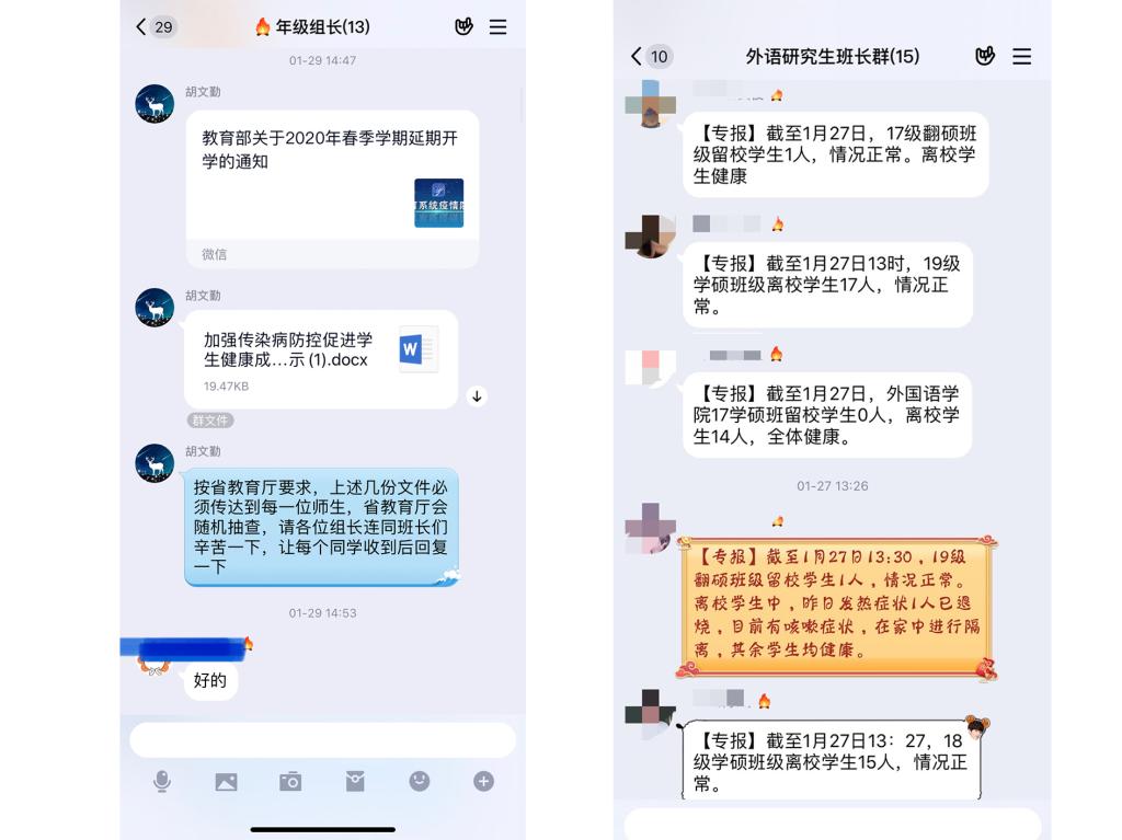 1.落实平安日报制度。1月24日,从一声声“新春快乐,平平安安”开始,YABO鸭脖官网开始了同学们每天的平安报告,坚持“零报告”制度,做到本研学生100%全覆盖。与此同时,学院辅导员通过年级群、班长群、学务指导和班主任群、学生党员群、家长群等做好疫情防控的引导宣传工作,时时转发科学防疫注意事项以及相关工作通知。