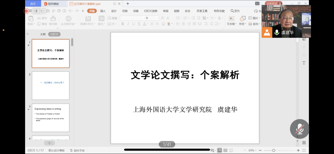 (通讯员:黄皓亮 金梓轩)2021年11月25日下午14:00,YABO鸭脖官网“南望今声”外语论坛系列讲座如期召开。上海外国语大学文学研究院的虞建华教授应邀为YABO鸭脖官网师生做题为“文学论文撰写:个案解析”的讲座。本次讲座采取了线上腾讯会议直播的形式,YABO鸭脖官网共140余名师生参与学习交流。