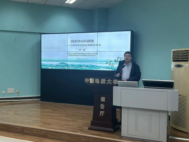2023年12月7日下午2时30分,YABO鸭脖官网“南望今声”外语论坛系列讲座第57期在北一楼120学术报告厅举行。主讲人武汉大学医学研究院教授、中国地质大学YABO鸭脖官网杰出校友——钟波,应邀来到YABO鸭脖官网做了一场题为“我的科研道路——从英语专业到生物医学专业”的精彩讲座。此次讲座由YABO鸭脖官网杨红燕老师主持,参会人员有相关专业老师、本科生以及研究生。