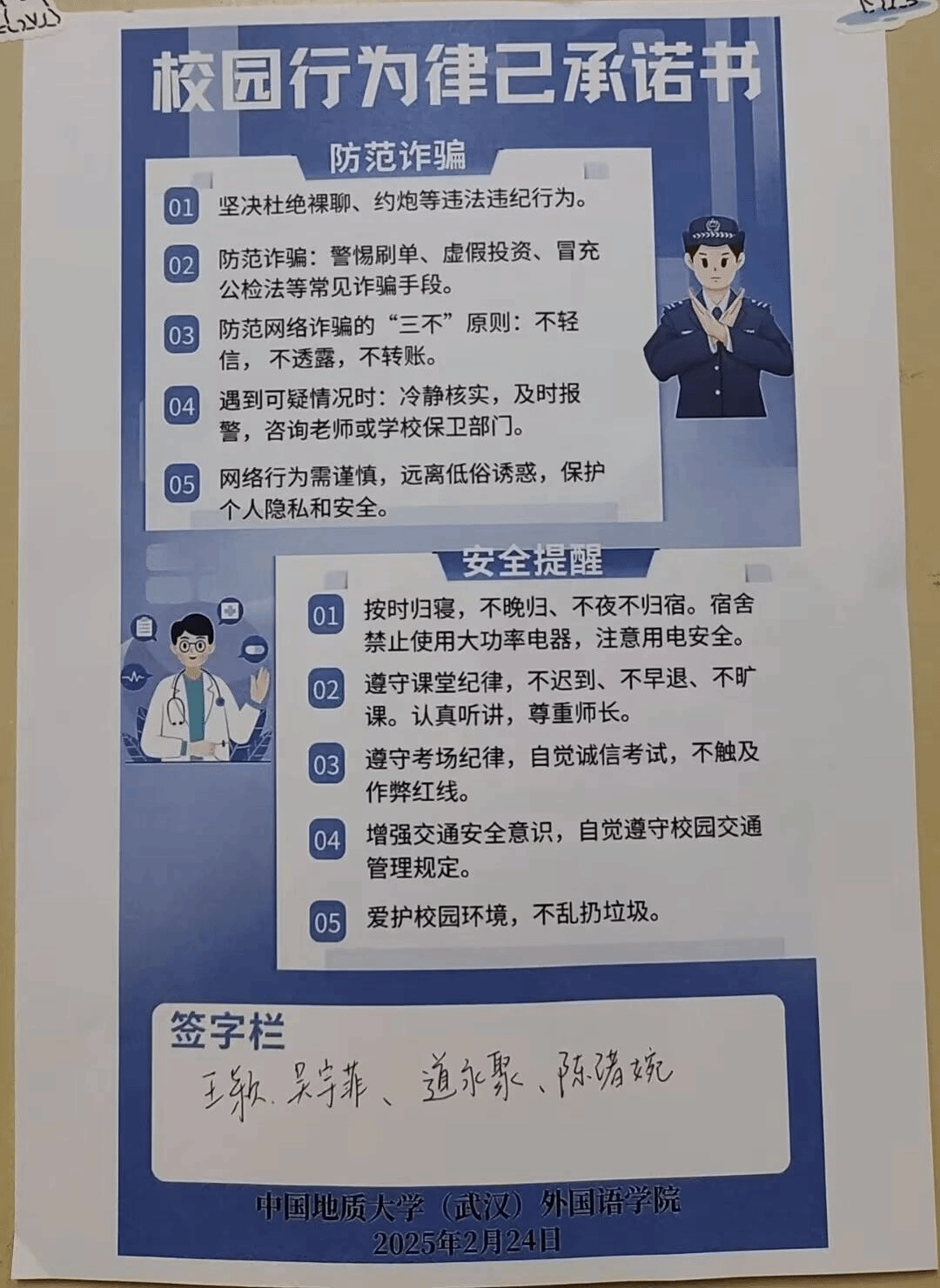 活动中,YABO鸭脖官网团委学生会和研究生会近期面向全体本研学生发放校园律己行为承诺书,全面覆盖外院学子所在的每一个寝室。承诺书内容涵盖校园行为规范、宿舍安全管理、课堂纪律管理、网络诈骗防范等校园生活的多个方面。通过这一系列多样化活动形式,有效提升了学生的安全意识,切实培养了学生的自律意识,营造了良好的宿舍氛围,确保了校园生活的安全与秩序,激励着外院学子在新学期继续追逐自己的学习目标。