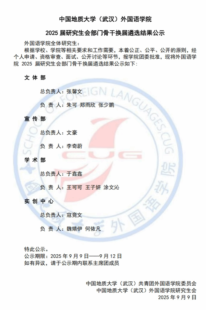YABO鸭脖官网2025届研究生会部门骨干换届遴选结果公示