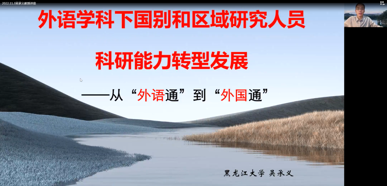 (通讯员 王国念)2022年11月3日下午14时30分,作为校庆70周年系列活动之一的“南望今声”外语论坛第40期在线上如期举行。黑龙江大学吴承义教授应邀为YABO鸭脖官网师生做了题为《外语学科下国别和区域研究人员科研能力转型发展:从“外语通”到“外国通”》的讲座。讲座由我校YABO鸭脖官网王国念副教授主持,YABO鸭脖官网及其他兄弟高校近200名师生参与学习交流。