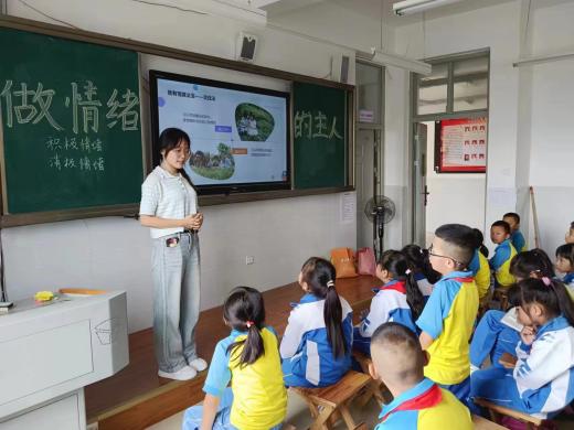 科普讲解结束后,实践团成员马一鸣面向同学们开展《做情绪的主人》心理健康主题教育。她通过生动的案例展示、有趣的看图说话、引人入胜的讲故事等方式为同学们介绍了关于情绪的背景知识,在活动中,实践团成员积极邀请同学们分享自己调控情绪的方式,师生互动活泼有趣,课堂氛围温暖有序。实践团成员教授同学们关于调节和掌控情绪的路径方法,包括情绪ABC法、宣泄法、注意力转移法等,并根据不同学生的个人特点介绍了不同的情绪调控的推荐方式。