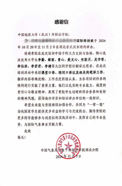 11月7日,中国气象局气象干部培训学院湖北分院给YABO鸭脖官网发来感谢信,以感谢YABO鸭脖官网师生在此次培训活动中给予的大力支持与协助。