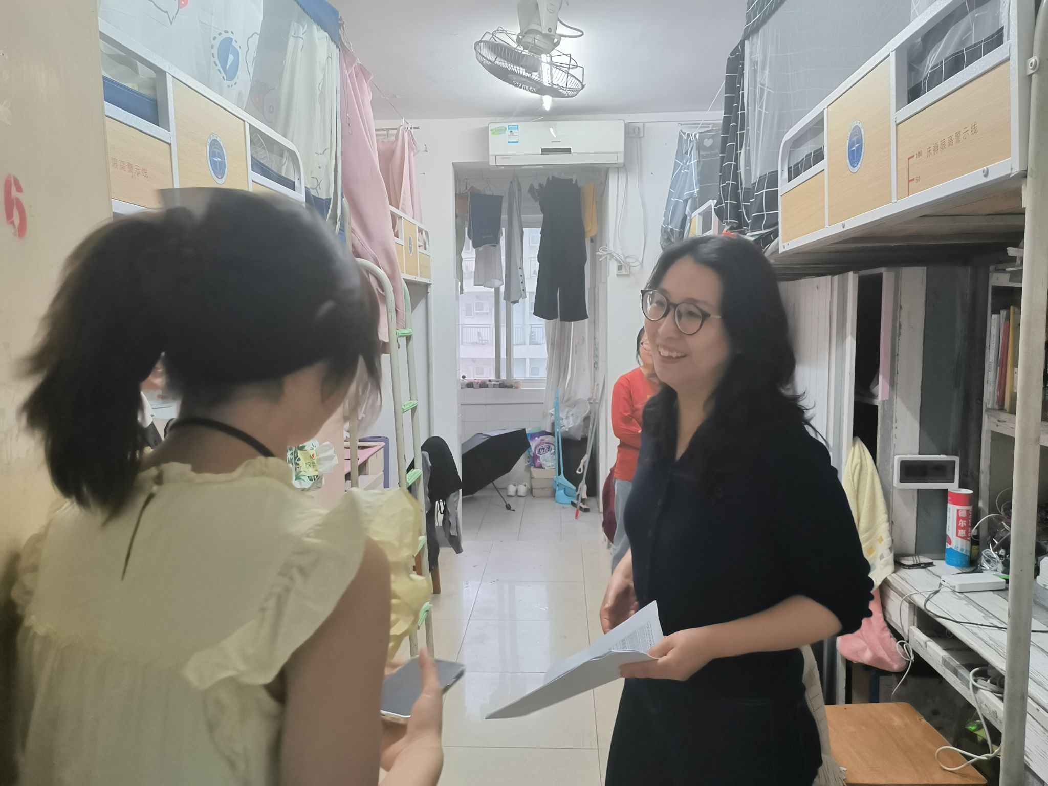 在学生宿舍走访过程中,学院领导与同学们亲切交流,详细询问他们的学习、生活情况,听取他们对学习生活和学院发展的建议和意见,特别强调要树立大安全观。领导们反复叮嘱同学们要强化安全意识,时刻保持警惕,注意防火、防盗、防诈骗等。