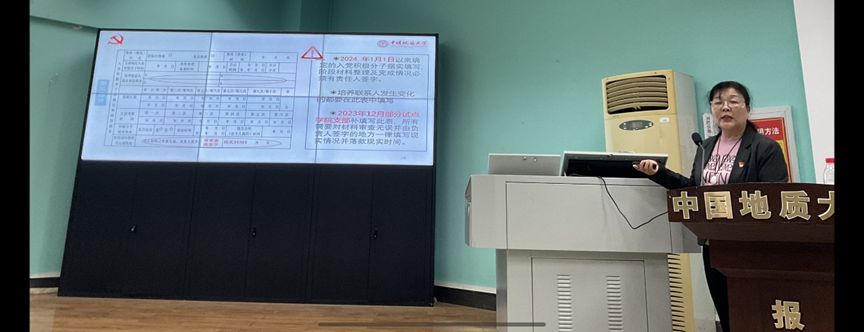 于荣萍老师就党员发展相关的知识进行了简要问答,并与同学们积极互动;对学生党员发展工作中培养联系人应该扮演什么样的角色提出了要求;对于试行的《党员发展全程纪实表》,详细介绍其填写细则与规范,举例说明毕业生在工作后可能面对的党员材料缺失风险,并呼吁大家做好表格填写工作,为党员材料回溯提供参考。